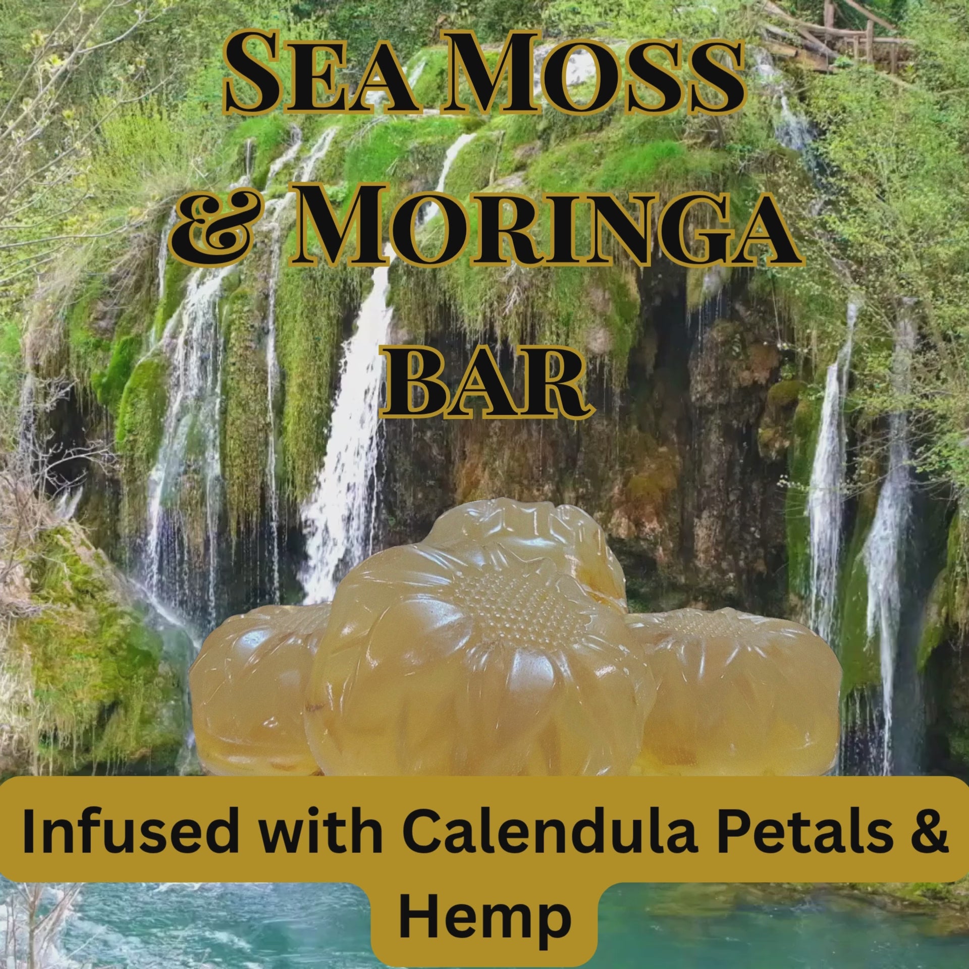 Indulge your skin in a botanical powerhouse with our Sea Moss Moringa Hemp & Calendula Bar crafted for deep nourishment, gentle healing, and radiant restoration. This luxurious bar blends wildcrafted sea moss with antioxidant-rich moringa, soothing calendula petals, and omega-packed hemp seed oil to deliver a calming cleanse that promotes glowing, balanced skin.